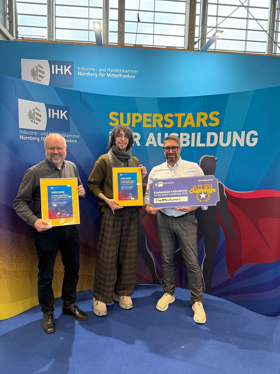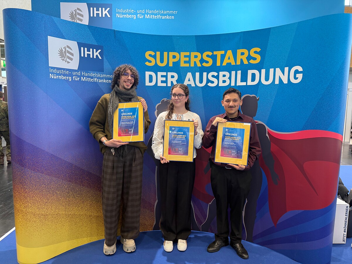 Zum zweiten Mal haben wir drei Azubis für ihre besonderen Leistungen mit dem Titel "Super-Azubis" ausgezeichnet. Die feierliche Übergabe der Urkunden fand Anfang Dezember im Rahmen der Messe "Berufsbildung 2025" statt. Die drei ausgezeichneten Azubis hatten ihre Ausbildenden mit Motivation, Einsatzbereitschaft und Leistungsstärke überzeugt.