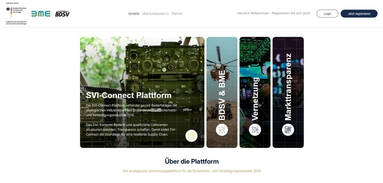 Entwickelt wurde die Plattform vom Bundesverband Materialwirtschaft, Einkauf und Logistik (BME) sowie dem Bundesverband der Deutschen Sicherheits- und Verteidigungsindustrie (BDSV). Die Deutsche Industrie- und Handelskammer (DIHK) und die deutschen IHKs unterstützen SVI‑Connect ausdrücklich, weil die Plattform einen wichtigen Beitrag zur Diversifizierung und Stabilisierung der industriellen Basis in Deutschland leistet. Unternehmen erhalten einen niedrigschwelligen Zugang zu einem Markt, der zunehmend an Bedeutung gewinnt und in dem neue Zulieferer dringend gesucht werden.