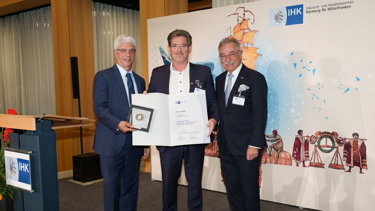 Nürnberg – Für herausragende unternehmerische Leistungen und sein Engagement für die Wirtschaftsregion Mittelfranken hat Bernd Krebs die Ehrenmedaille der IHK Nürnberg für Mittelfranken erhalten. Die Verleihung erfolgte am 9. Oktober 2025 beim IHK-Jahresempfang „Politik | Wirtschaft“ im Haus der Wirtschaft. Die Laudatio hielt Prof. Dieter Kempf, ehemaliger Präsident des Bundesverbands der Deutschen Industrie (BDI).