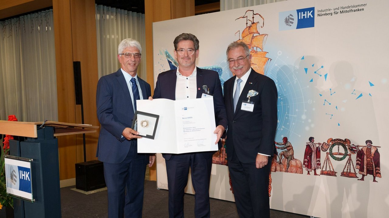 Für herausragende unternehmerische Leistungen und sein Engagement für die Wirtschaftsregion Mittelfranken hat Bernd Krebs die Ehrenmedaille der IHK Nürnberg für Mittelfranken erhalten. Die Verleihung erfolgte beim IHK-Jahresempfang „Politik | Wirtschaft“ im „Haus der Wirtschaft“ in Nürnberg. Die Laudatio hielt Prof. Dieter Kempf, ehemaliger Präsident des Bundesverbands der Deutschen Industrie (BDI). Mit der Ehrenmedaille zeichnet die IHK Persönlichkeiten aus, die den Standort sichtbar voranbringen: durch unternehmerische Erfolge und Innovationsimpulse, durch Ausbildung und Beschäftigung sowie durch ehrenamtliches und gesellschaftliches Engagement.